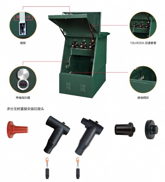 电缆分支箱以单向开门、横向多通母排为主要特点,具有宽度小、组合灵活、全绝缘、全密封等显著优点。按照额定电流一般可以分为600A 主回路和200A 支回路两种。