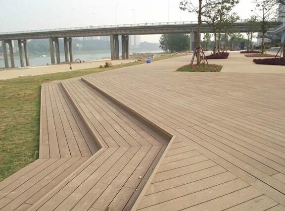 强度好,密度高(1.2),纹理自然,色泽典雅,绿色环保,耐水,耐腐蚀,似木非木,适用于亲水平台,栈道,码..