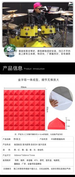 4、金字塔吸音海绵吸收频率可达到500HZ以上,这样保证了在室内声学处理中,有一个平坦的吸收曲线;即使你使用的再多,听到的也是一个干声,而不是一个摘掉了高音喇叭的闷声