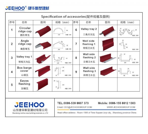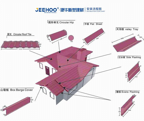 彩石瓦配件分为圆弧脊瓦,角型脊瓦,平板,天沟板等。可以根据客户要求定做