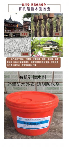 有机硅防水剂是一种*、无刺激性的新型高效防水材料,喷涂(或涂刷)于建筑物表面后,可在其表面形成一层无色透明、抗紫外线的透气薄膜,当雨水吹打其上或遇潮湿空气时,水滴会自然流淌,阻止水分侵入,同时还可以将建筑物表面尘土冲刷干净,从而起到使内墙防潮、防霉、外墙洁净及防止风化等作用。