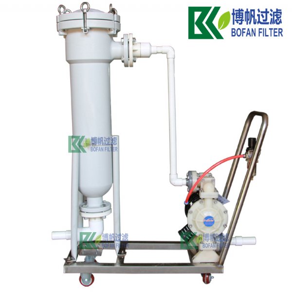 PP过滤器,为化工行业开发和设计,是一款经济实用型防腐过滤器,广泛应用于酸、碱腐蚀性物料的固液分离场合。全塑筒体及配件,采用PVDF、 PPH、PPR等防腐塑胶材质,实现无金属部件与物料接触,能胜任高温、高浓度的盐酸、硫酸、王水等强酸强碱药液过滤及大部份化学药液过滤。产品采用快开方式,维护便捷,易拆卸。简体底部采用巧妙斜坡设计,过滤后无积液残留。一体成型的模具注塑制造工艺,使得筒体无任何焊入接口及焊点,内表面光滑无死角。该全塑防腐过滤器在化工行业应用广泛。