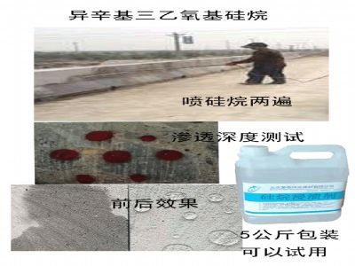 混凝土防腐硅烷浸渍剂为小分子结构可穿透胶结性表面,渗透到混凝土内部与暴露在酸性或碱性环境中的空气及基底中的水分子发生化学反应,形成一斥水处理层,从而抑制水分进入到基底中。产生防水、抗紫外线的性能且具有透气性。可有效防止基材因渗水、日照、酸雨和海水的侵蚀而对混凝土及内部钢筋结构的腐蚀、疏松、剥落、霉变而引发的病变,提高建筑物的使用寿命。经保护的基材具有良好的斥水性,并保留原有的外观。碱性环境如浇注不久的混凝土,会刺激该反应并加速斥水层的形成。