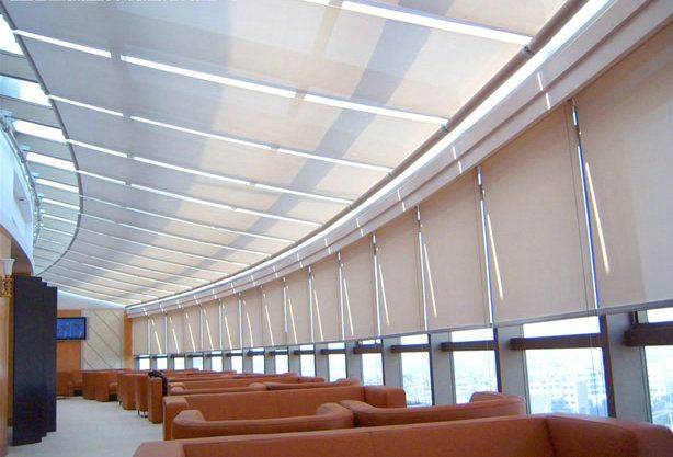 FSS电动天棚帘、电动遮阳帘系统使用管状电机,采用一条弹簧和一台管状电机;面料一端贴在装有弹簧的卷管上。..