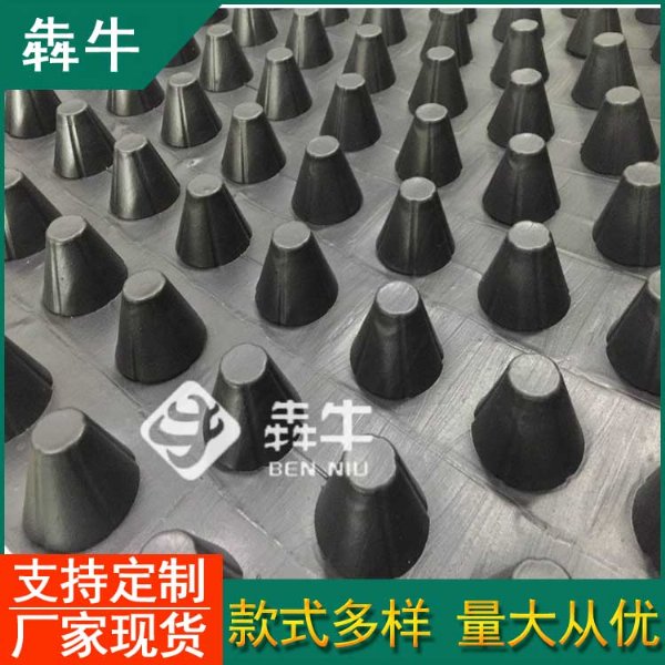 圆锥突台的顶面胶接一层过滤土工布,以阻止泥土微粒通过,从而避免排水通道阻塞使孔道排水顺畅。传统的排水方式使用砖石瓦块作为导滤层、使用较多的鹅卵石或碎石作为滤水层、将水排到*地点。而用排水板取代鹅卵石滤水层来排水则省时、省力又节能、节省投资、还能降低建筑物的荷载。