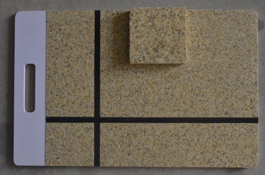 ·玻彩片细节性的搭配比例,使主、次、大、小参差交错又互相溶合,使玻彩石视觉上更厚实,并且多变而又显得细腻;加之不亲水特性,自带防水特性;