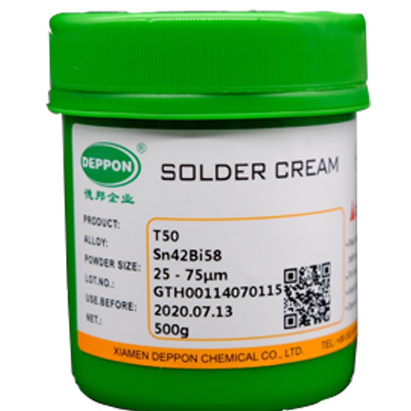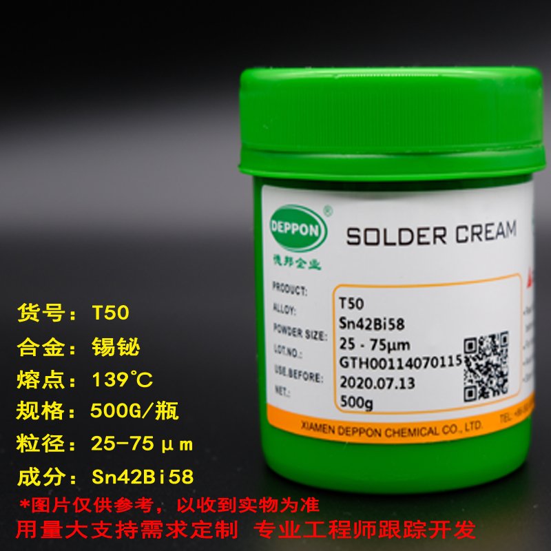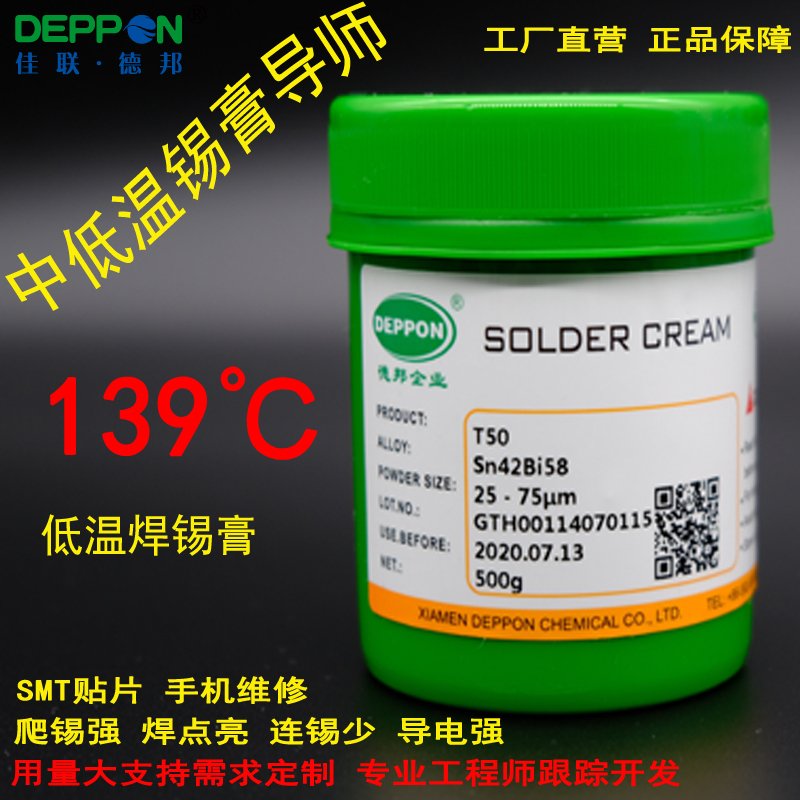 DEPPON/德邦焊锡膏低温锡浆,T50焊锡膏是一款低温无铅免清洗焊锡膏,适用于不耐高温的板材或元件。优异的分配和流动性适应钢网及滚筒印刷工艺,在 8 小时的使用中均可提供卓越的印刷性能,可用于通孔焊接工艺。粘性高,粘力持久,确保插件时不产生滴落,朝下回流焊锡不滴落,返修减少,提高首次通过率。T50 是一款高活性焊锡膏,抗热坍塌性能优良,因此它能在比较宽的曲线范围内起到有效的焊接效果。焊点外观优秀,易于目检。IPC 焊剂分类为 ROL0级,确保产品环保和可靠性。