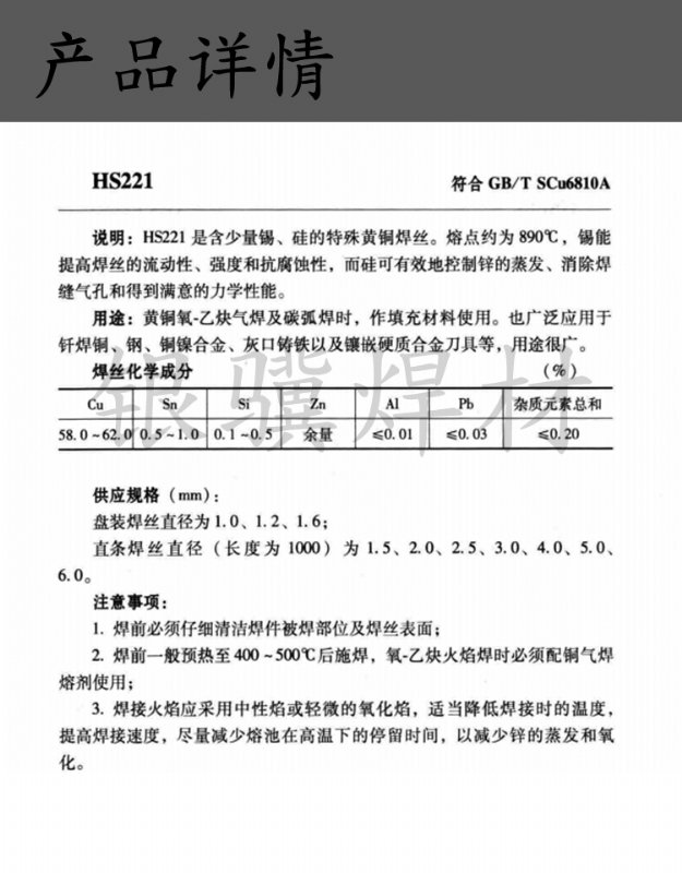 说明:S221是含少量锡和硅的特殊黄铜焊丝。锡能提高焊丝的流动性,而硅可以有效地控制锌的蒸发,消除气孔,从而得到良好的焊缝。