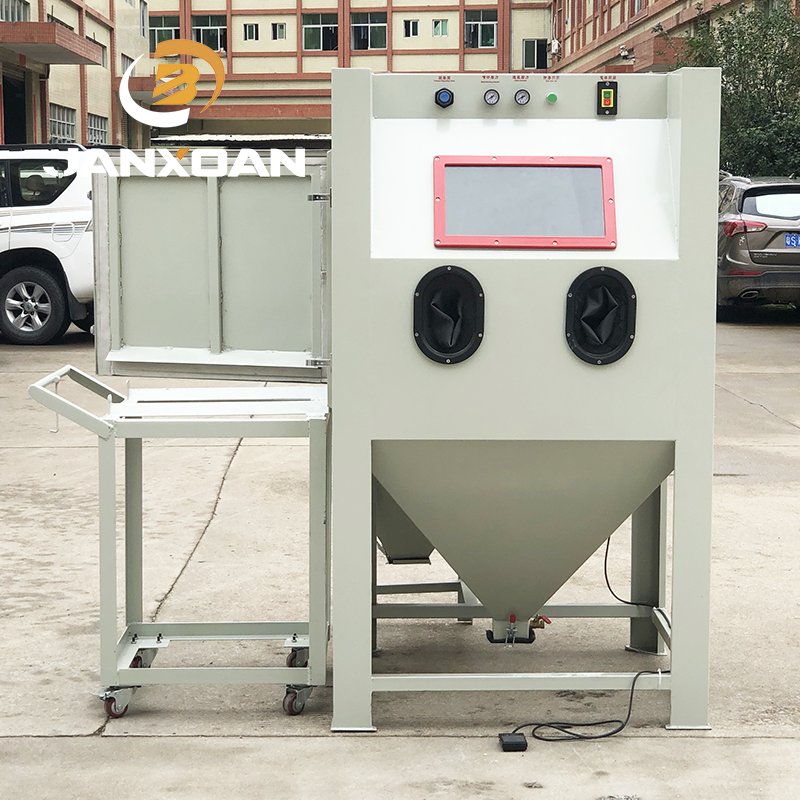 推车转盘手动机简介: 1可加装活动台车和转盘,操作时仅需将工件放在台车转盘上,然后将推入机内即可从事喷砂..