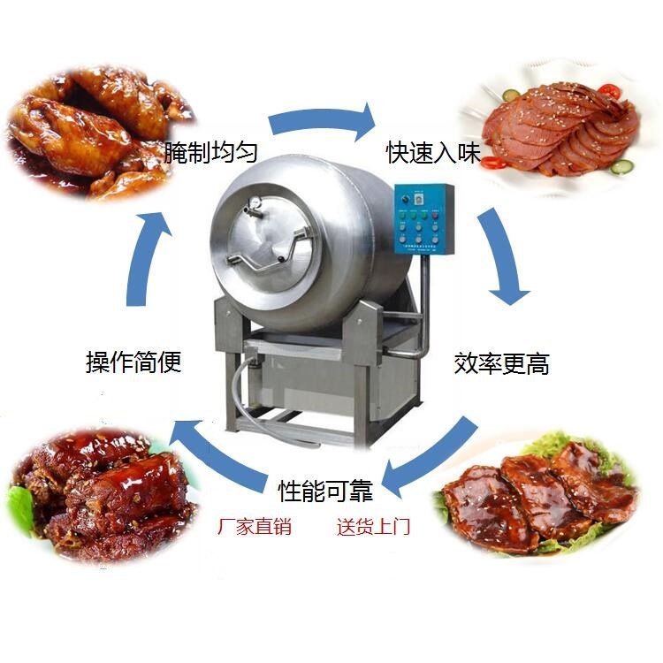 真空滚揉机不锈钢制造,经久耐用。大功率真空泵,性能可靠。旋压式封帽设计滚筒,装料量多,滚揉空间大。齿轮静音电机,无噪音,无需保养。我公司生产的真空滚揉机是肉类腌制入味的良好设备。
