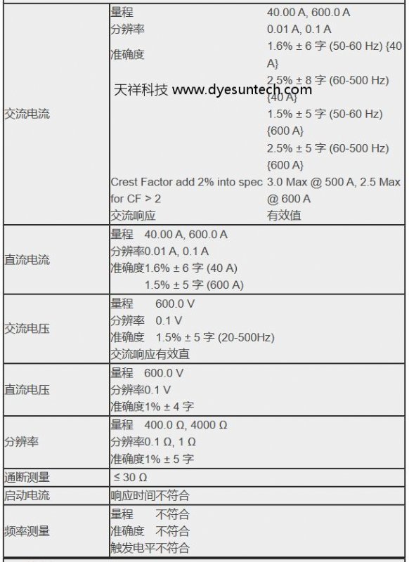 该款光伏系统用钳形电流表除了具备一系列的测试功能,还具备了启动电流和频率功能,方便进行光伏系统和照明等设备的测量。技术规格数字显频 6000字分辨率电池低电量指示 电池低电量指示电源 3颗AAA IEC LR03 电池数字钳形表钳口开度 1.45 in (37 mm)钳开口度 1.45 in (37 mm)数字钳形表尺寸(长X宽X高) 6.39 in x 2.29 in x 1.20 in (162.4 mm x 58.25 mm x 30.5 mm)数字钳形表重量 384g (包括电池)自动量程 Ohms安全 CE EN/IEC 61010-1 和 IEC 61010-2-032 安装类别III, 600V工作环境