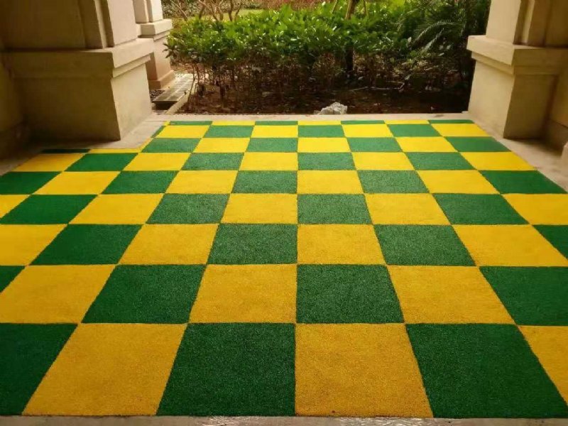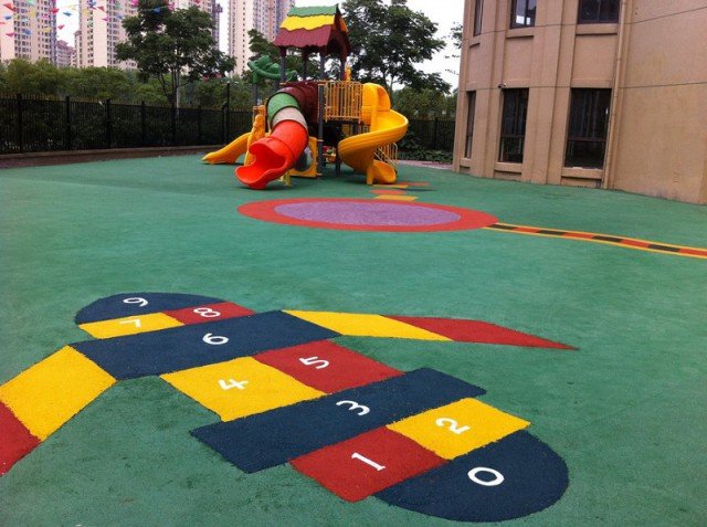 EPDM透气型塑胶场地,花色有红黄蓝绿等十多种颜色,可任意搭配图案。