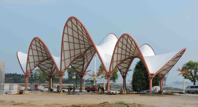 膜结构遮阳棚,坐落于马来西亚,该建筑物是由钢结构和永久性膜材PTFE膜结合建造而成,张拉膜结构是通过施加..