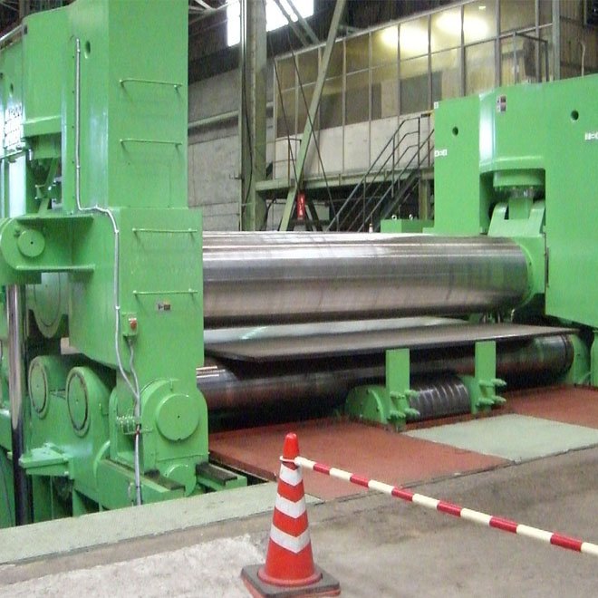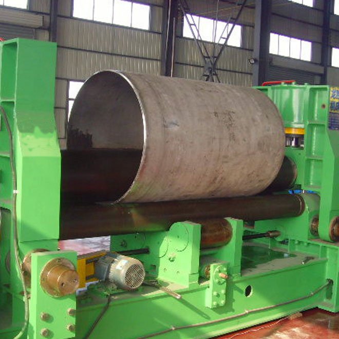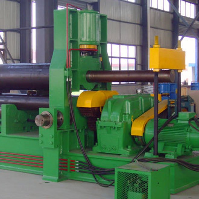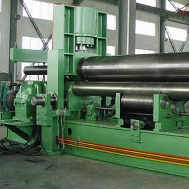上辊呈鼓形状,下辊的下部 有托辊配合调节,从薄板到厚板这一广泛的范围内能够卷制直线度很高的制品(国家专利)。