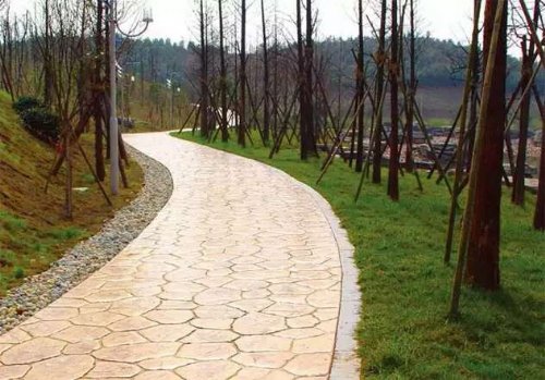 2. 用硬化剂材料制作的彩色压模地坪具有抗耐磨、防滑、抗冻、不易起尘、易清洁、高强度、耐冲击、且色彩和款式方面有广泛的选择性、灵活性、成本低和优质环保等特点,是目前园林、市政、停车场、公园小道、商业街区和文化娱乐设施领域的理想选择。