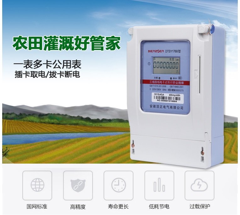 特点∶准确度高,稳定可靠,长寿命,功耗低,数据回传,报警功能,自动断电,查询电里,抗碱坏能力强,一表一卡。品质保证:自本公司出售之日起,当用户完全遵守电能表的运输﹑储存﹑安装及使用规定,并在本公司铅封完整的条件下,按照产品使用要求正常使用,我们承诺提供5年质保!