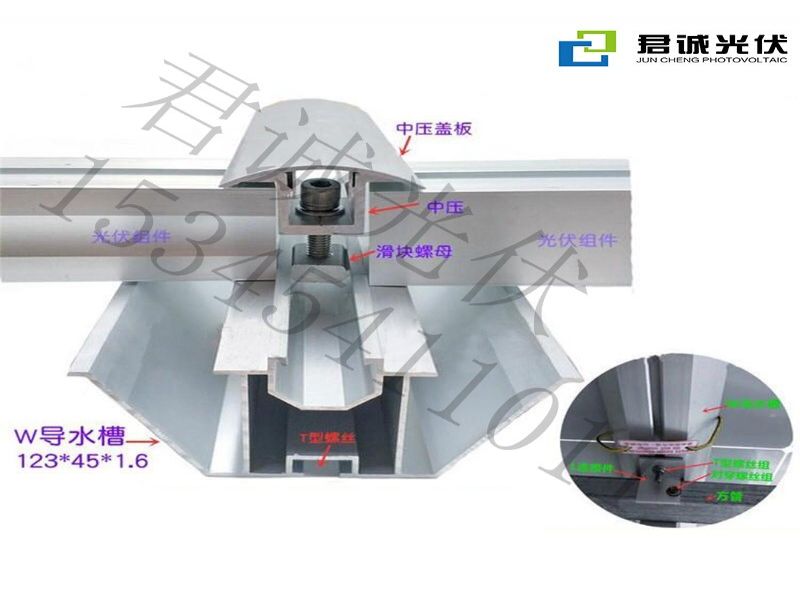 答:防水支架的W导水槽如果超长,需要切断(本公司*长材料6米6),我们在连接处用EPDM(三元乙丙)材质的橡胶连接件(汽车橡胶厂家供应,保证25年寿命)做防水,再配合1个铝合金连接件用4个T型螺丝组加固。 - 山东君诚光伏科技有限公司