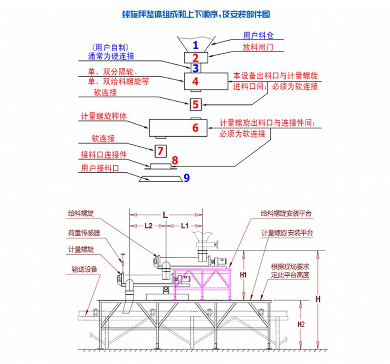 请注意:瑞川螺旋秤(这里指的是计量螺旋秤)的结构有两种,主要的区别是传感器的安装方式不同,一种是计量螺旋秤的传感器已经和秤体安装在一起,计量螺旋秤只要安装就位即可。另一种是传感器需要按下面的方法安装。其中原因是计量螺旋秤是根据现场工艺设计、生产,大小尺寸和要求各不相同。无法做到统一式样和统一结构您在安装时,一定要查看实际设备的结构,然后再动手安装。