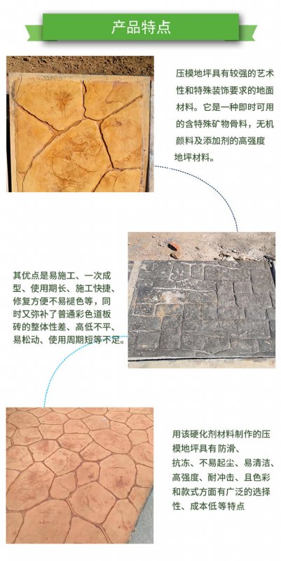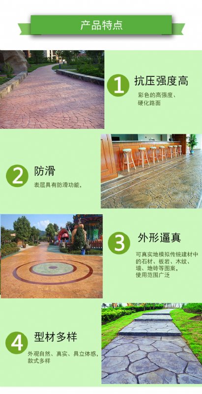 (压花地坪 压印地坪 彩色地坪 艺术地坪 压模地坪 景观地坪),此种材料已在上海及南方主要城市得到大面积推广,该产品广泛适用于工厂(公司)园区、公共停车场、广场、人行道、住宅小区、花园步道等。而且抗压耐磨、不变色、不粉化、经久耐用的环保绿色地坪。