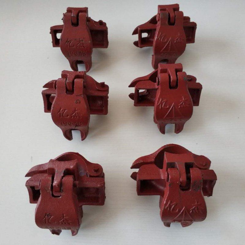 国内常用的扣件是铸铁制作,其机械性能应符合《钢管脚手架扣件》(GB15831-2006)材质不低于KT330-08。扣件有三种产品:直角扣件,对接扣件,旋转扣件。用编织袋包装,每包是25个。每个的重量应为1.1KG(含螺栓及螺母)。一般情况下是采用蘸红色的防锈漆的形式做防锈处理的。与架子管配套使用。一般扣件产品的生产及采购配比是8:1:1。就是说在比例是直角占到80%,对接10%,旋转10%。