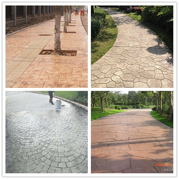 压模地坪,彩色地坪拥有几十种标准颜色和二三十种造型模具,通过复合着色技术可呈现天然石材的色泽及图案,如木纹、石块、古代砖、花岗岩、砂岩等,形成一种自然、轻松、古朴、有艺术韵味的艺术地坪系统。 - 上海璟石景观工程有限公司