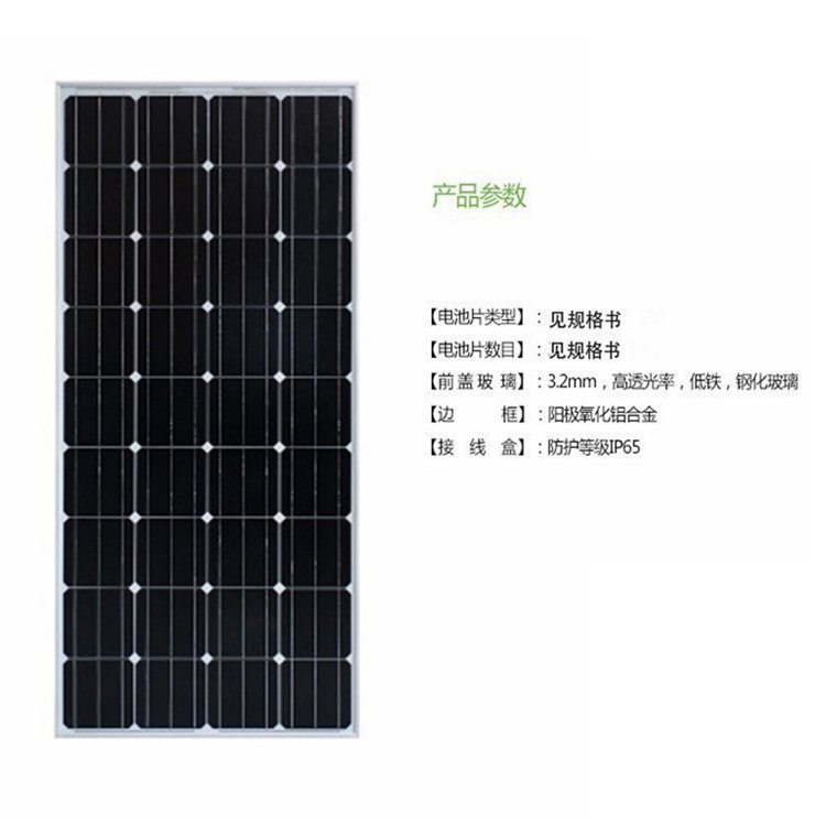 7.结构特性:单晶硅太阳电池串并联,采用高强度低铁钢化玻璃,高性能抗老化EVA、耐候性优良的TPT 复合膜层压而成,透光率和机械强度高。