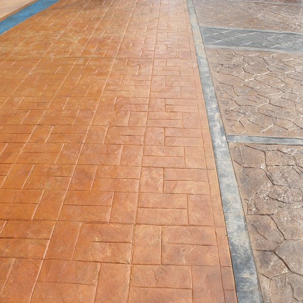 三、压模地坪施工说明: 压模地坪彩色面层是通过琪石压模地坪强固粉以及拼合调配合成的颜料,经特殊处理后渗透进混凝土表层。粉末状的琪石压模地坪脱模料是用于压模过程中保证混凝土面层完整的覆盖率,同时又提供了第二种颜色并与强固粉的基本颜色组合、从而创造出天然逼真的效果。琪石压模地坪保护剂的喷涂不仅起到保护混凝土的作用,而且使混凝土的颜色与图案更加鲜艳,层次质感更加强烈。