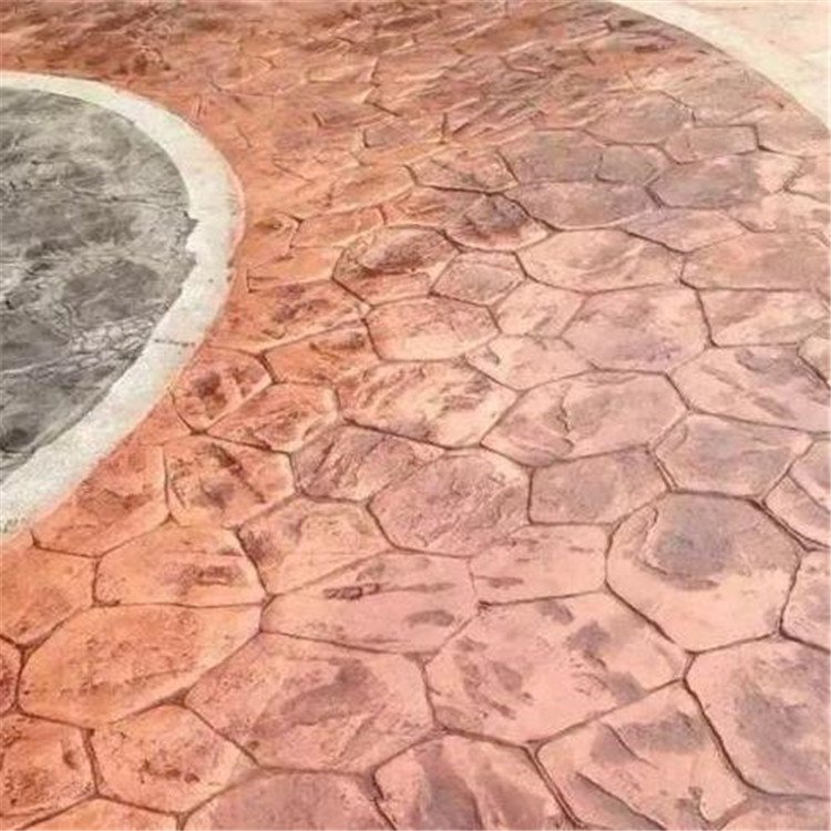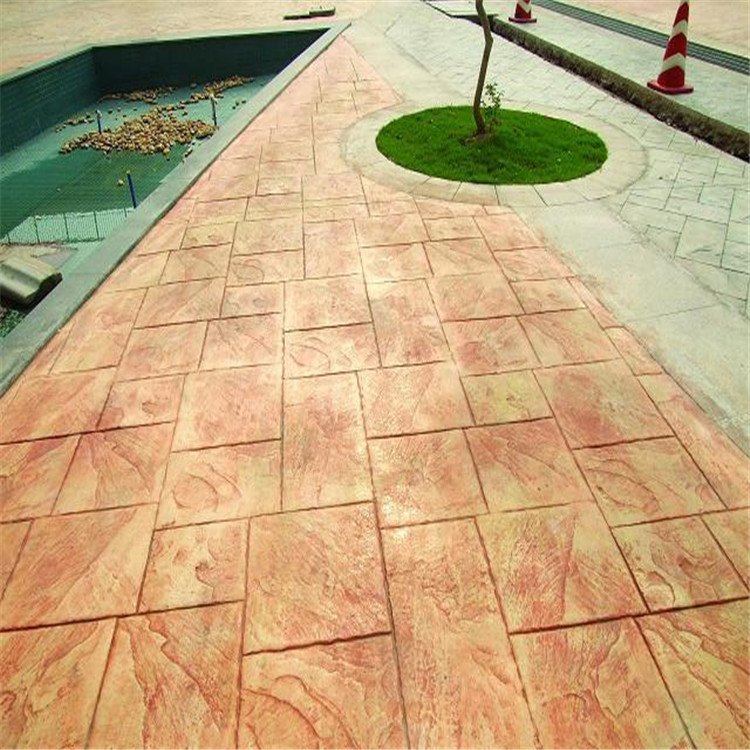 压模混凝土,压花地坪压印喷花系统拥有多款造型模具,可实现木纹、砖、板岩、砂岩、花岗岩、风化石、异型石的装饰效果,并可制作出有特殊设计要求的地面。可根据25种标准颜色调配出你所中意的颜色,通过多次复合着色技术可实现各种天然石材的色泽。