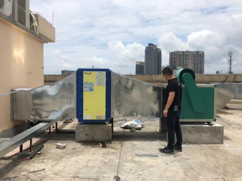 高碑店市馨云环保设备有限公司生产的低温等离子加动态拦截油烟净化器一体机在油烟空气净化设备前端的空气入口处..