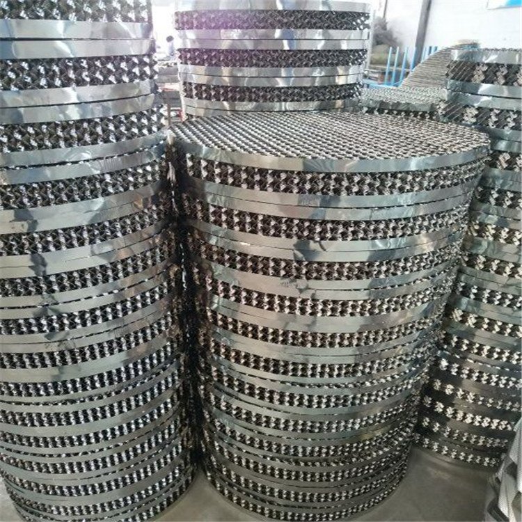 孔板填料实际生产时需注意直径小于800mm的做成一个个圆整的盘状,直径比塔的内径稍小。整盘填料应用钢带箍紧,箍的羰头搭接点焊,防止填料变形。上箍安装完后对上沿边切缝,留作填料装塔前翻边用,将箍做成防壁流圈形式。