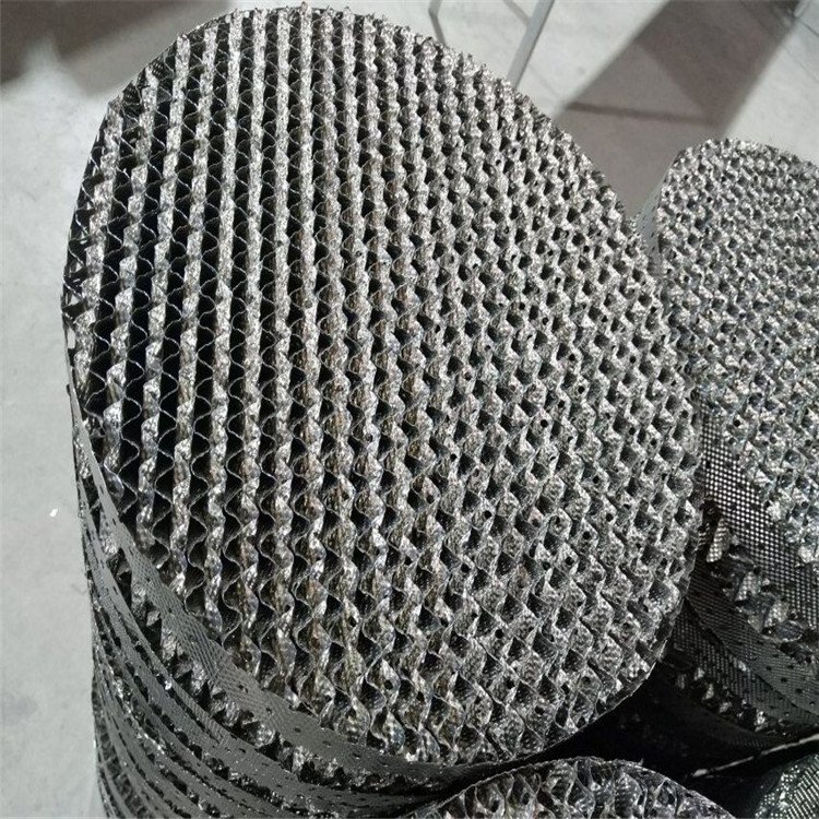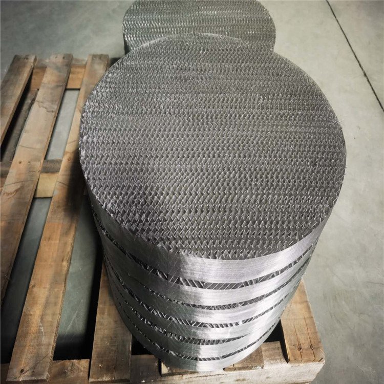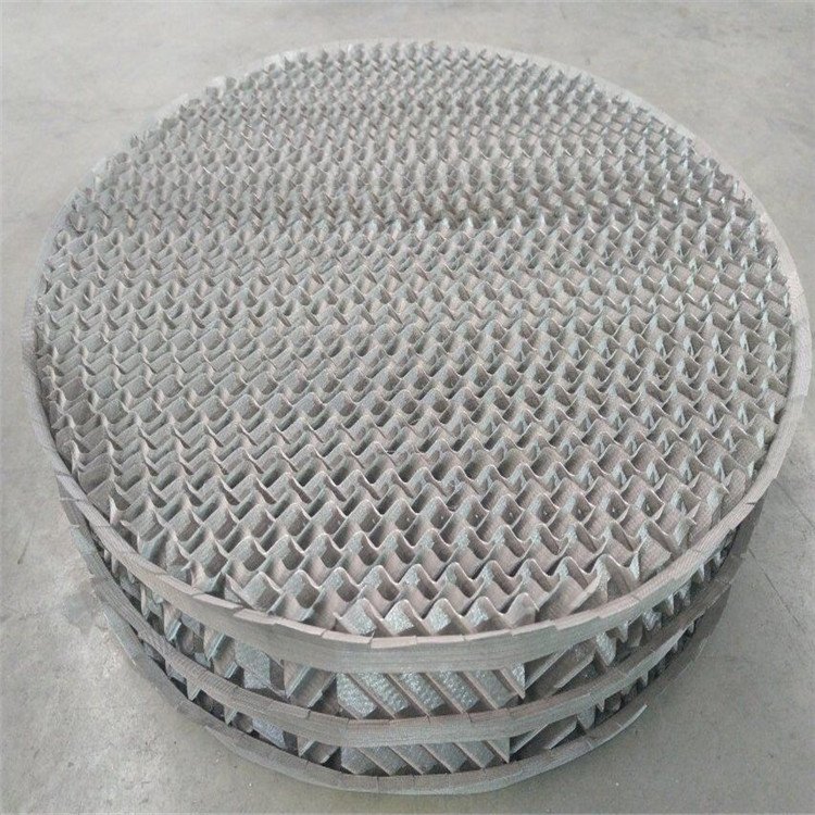 孔板填料主要作用是促进气液传质和分离。***适合的工作温度为200-400℃。由若干波纹平行且垂直排列的金属波纹片组成生产是应该注意,首先在金属薄板上采用滚压法在表面压出花纹,在波纹板上冲有φ4mm小孔,再按不同规格和比表面积用滚压轮压制出不同规格的波纹带,完成后按要求裁成不同的长度的波纹板,按尺寸要求将波纹板垂直均匀的排列成盘。相邻两片波纹板的波纹板倾角反向叠靠。