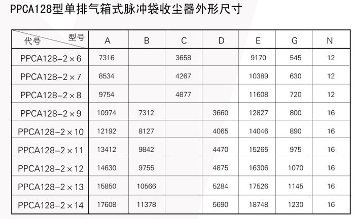 本系列收尘器为户外式由不同室数和每室的不同袋数,组成多种不同规格。每室的袋数有32、64、96和128袋四种。全系列共有33种规格,滤袋直径均为130mm,滤袋长度有2450mm和3060mm两种。本系列收尘器能负压或正压操作,其本体结构无任何改变。其收尘效率可达99.9%以上,净化后气体的含尘浓度100mg/m3 (标),本系列收尘器的主要技术性能分别见附表,本系列收尘器如用于寒冷地区,当室外采暖计算温度时≤-25°C时,需要增设加热装置,收尘器的壳机也要增设保温层。