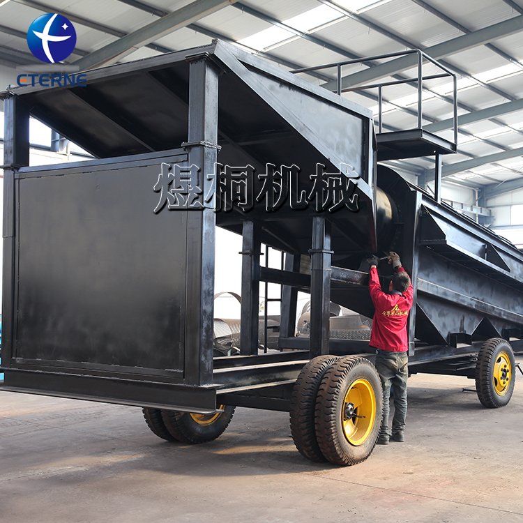 移动淘金车是一种在陆地上可移动的淘金设备,它有着结构紧凑、整体性强、重量轻、处理量大、操作简单、工作可靠,且易维护、移动方便等特点。该设备主要用于旱地沙滩、河道是一种重力选矿设备主要用于沙金矿的和脉矿中的单体金的回收工作。淘金车的主要组成部分有:料仓、滚筒筛、选矿设备(例如溜槽、溜槽或者尼尔森选矿机等)、移动车架、供水系统、电控柜等组成,整套淘金工作在此淘金车上进行,开采完矿区某个区域,再很方便的移动到另一个区域继续开采。 - 山东煜桐机械装备有限公司