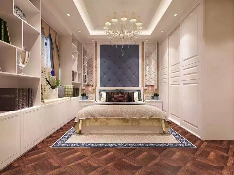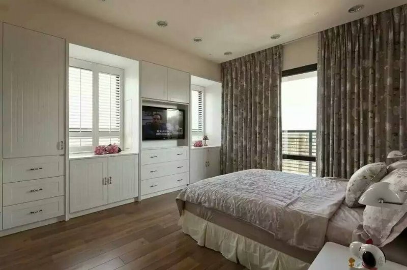 4、顶柜空间要大顶柜空间设计的要大一些。里面可以放一些面积大、重量小,又防潮的物品,如被子。有一定重量的物品放置在底柜中,既是出于安全的考虑,拿取物品时也更方便。