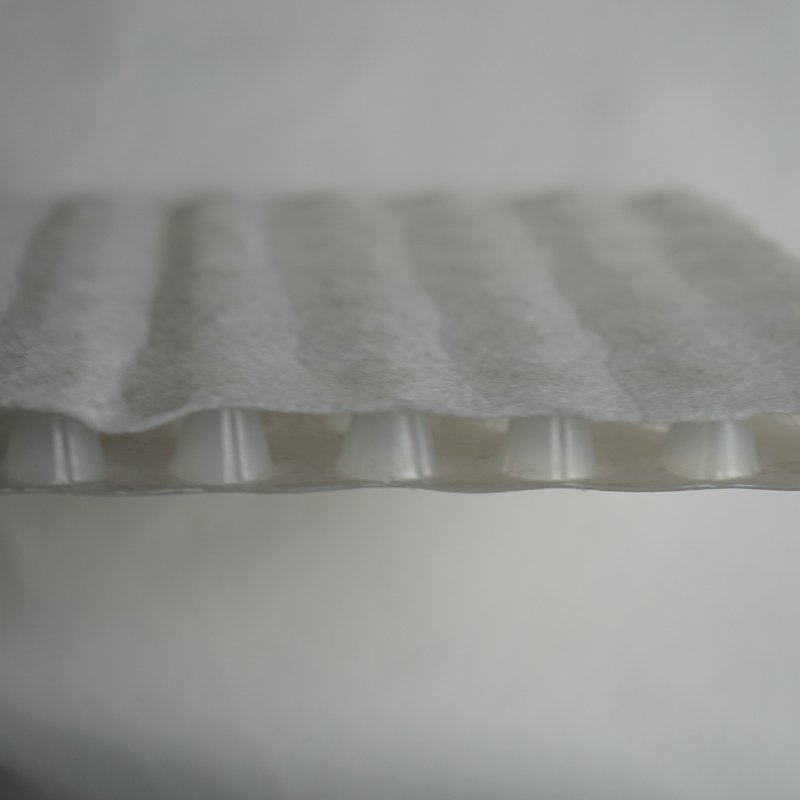 圆锥突台的顶面胶接一层过滤土工布,以阻止泥土微粒通过,从而避免排水通道阻塞使孔道排水顺畅。 传统的排水方式使用砖石瓦块作为导滤层、使用较多的鹅卵石或碎石作为滤水层、将水排到*地点。而用排水板取代鹅卵石滤水层来排水则省时、省力又节能、节省投资、还能降低建筑物的荷载。