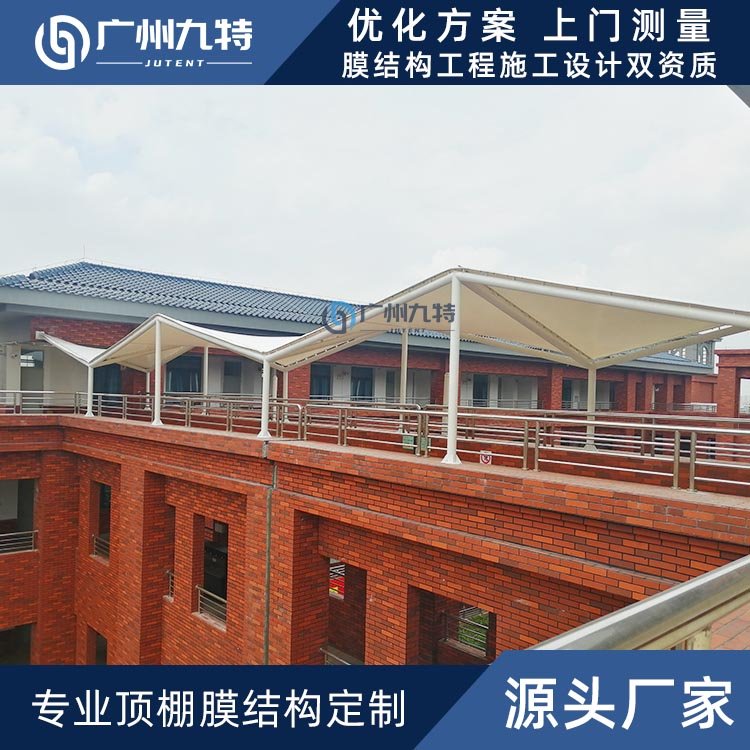 学校廊道遮阳棚,引用PVDF建筑膜材,使其外观造型多样化安装完工整体美观大气高端,膜结构实用性强,更具有艺术性,能和当地环境融合。项目多在学校放假期间施工,工期建造时间短,不影响学校正常开学。
