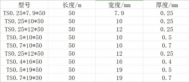 2.常规宽度4.6*.025、7.9*0.25、10*0.25、10*0.5、12*0.25、16*0.4、19*0.5mm长度可以根据客户要求定做。