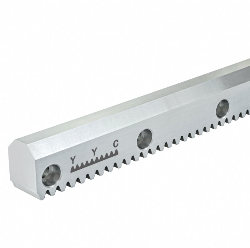 采用德国DIN标准规范,右斜19°3142的设计,有利于齿条和齿轮行走时,啮合更加顺畅且低噪音,相较于直齿,同样的模数大小,斜齿齿条扭力更高,干涉与摩擦更小,属于高度精密的传动零件,齿条经过热处理,钢性高,耐磨耗,也可以在高扭力的需求下工作,齿面经过研磨,粗糙度为Ra0.8,运行顺畅低噪音。