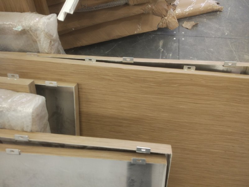 Aluminum alloy composite natural and technological solid wood veneer is a complex and tedious processing process,which needs to go through many processes such as metal chrome, grinding coarsening, wood board bonding, edge trimming by blasting color powder scraping, PU spraying, drying and polishing, finishing coat covering. Each process must be completed by hand, and the process requirements are very high.