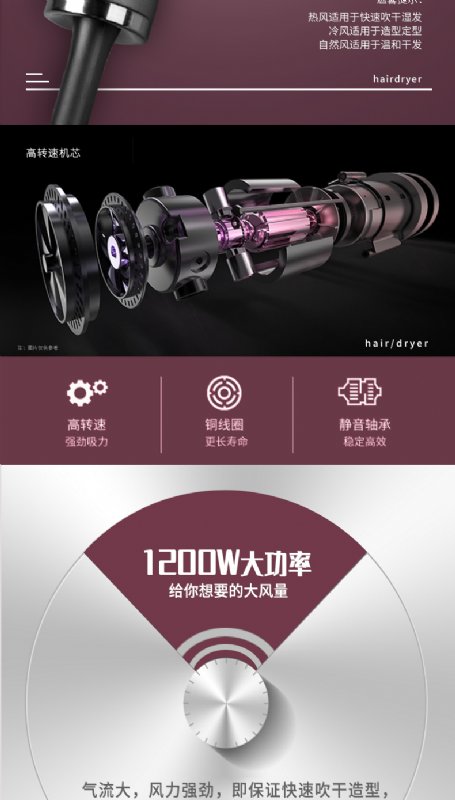 热风快速吹干湿发,冷风造型定型,自然风温和干发