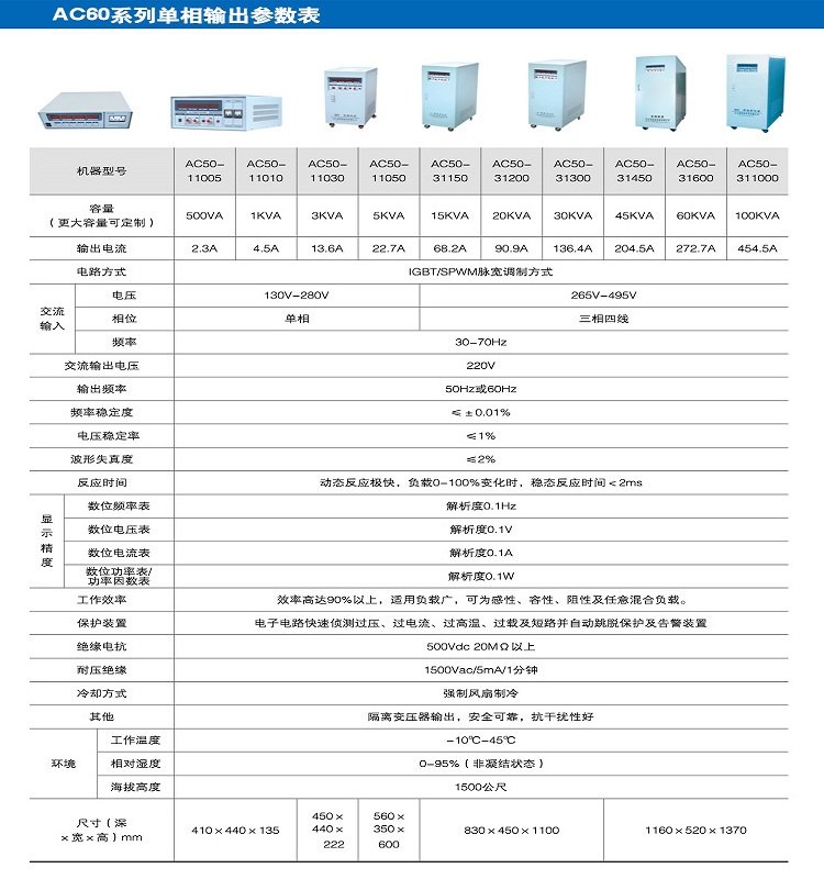 AC60系列电源是将市电通过功率变换电路转变为所需电压和频率的一种电源,其主要特点是提供纯净可靠的正弦波电力输出、低谐波失真、高稳定度的频率和电压。可以模拟世界各地不同电压及频率的输出特性,涵盖了整个产业的需求,完全符合工程师在设计开发、生产线测试及品保的产品检测、寿命、过高压/过低压模拟测试、进口设备及生产线供电等应用。