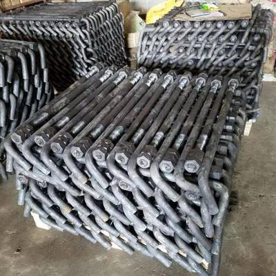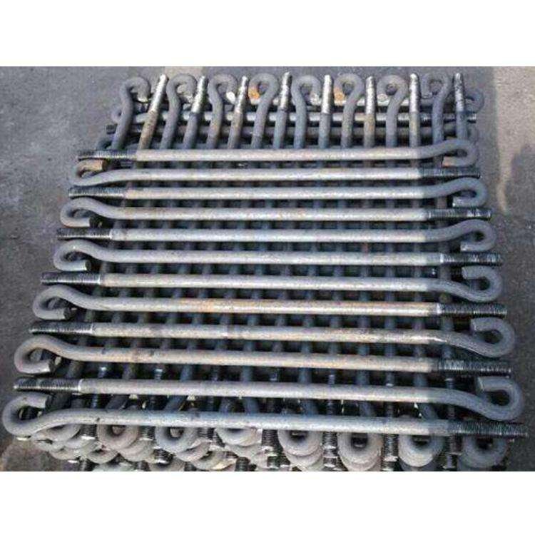 地脚螺栓一般用材料碳钢,Q235,Q345,45#钢制作而成,常用于建筑,交通,五金,建筑工地等领域,其中用Q235钢(光圆)埋深一般为其直径的25倍,然后做一个120mm左右长的90度弯钩。Q345螺纹钢的话强度大,做螺母的丝扣没有光圆的容易。如果螺栓直径很大(如45mm)埋深太深的话,可以在螺栓端部焊方板,即做一个大头就可以了(不过也是有一定要求的)。埋深和弯钩都是为了保证螺栓与基础的摩擦力,不至于使螺栓发生拔出破坏。地脚螺栓的抗拉能力就是圆钢本身的抗拉能力了,大小等于截面面积乘以许用应力值就是设计时的允许抗拉承载力。地脚螺栓在混凝土基础上安装时,将这种螺栓的呈J形、L形的一端埋入混凝土中使用,在做房子打地基时候,也用于确保地基的稳定。