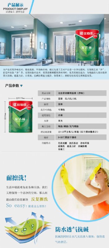 本产品采用精选、环保的原料,通过先进工艺对产品进一步净化提纯,实现精艺求“净”,打造环保新“净”界。采用创新的技术,使其漆膜细腻爽滑的同时,更具有耐洗能力,为墙面持久清洁提供强大保障;遮盖力好、白度高、抗碱防霉能力优异、容易施工,助您轻松实现完美墙面效果。