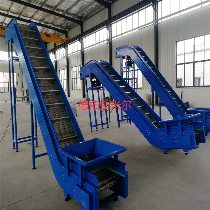 链板输送机 是一种以标准链板为承载面,由马达减速机为动力传动的传送装置。链板式输送机,由动力装置(电机)、传动轴、滚筒、张紧装置、链轮、链条、轴承、润滑剂、链板等等构成。其中带动物料的输送的主要的两个部分为:链条,利用它的循环往复运动提供牵引动力;金属板,作为输送过程中的承载体。可以通过多列链板并行,使链板输送机做的很宽并形成差速,利用多列链板的速度差使多列输送在无挤压的情况下变为单列输送,从而满足饮料贴标、灌装、清洗等设备的单列输送的要求,我们可以将两条链板输送机的头尾部做成重叠式的混合链使得瓶(罐)体处于动态过度状态,使输送线上不滞留物料,可以满足空瓶以及实瓶压力和无压力输送。 - 德拓斯米尔自动化设备(德州)有限公司
