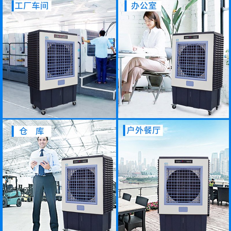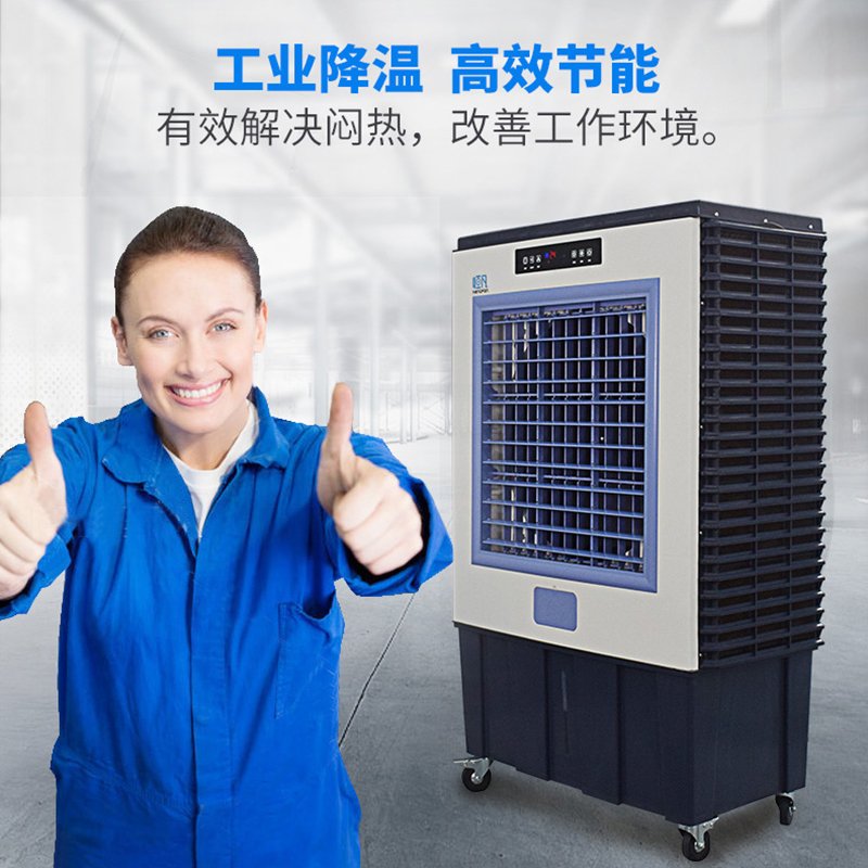 免安装:没外机,无需安装,机身有万向脚轮,移动方便。接自来水管或是人工加水,插电即可,利用水蒸发吸热制冷, 空气流动,水就吸收空气中的热量而蒸发,使空气温度下降,从而使室内产生通风换气、降温的效果。