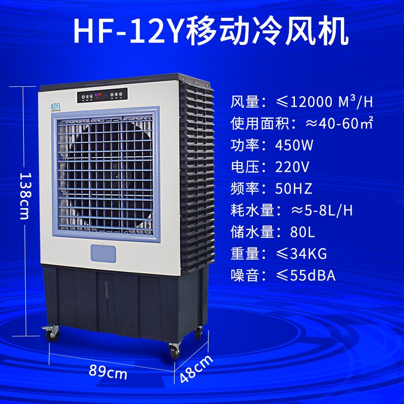HF-12Y,12000风量,电压220V/功率450W, 送风距离10-12米,覆盖面积60-80平方米 。低噪音设计。