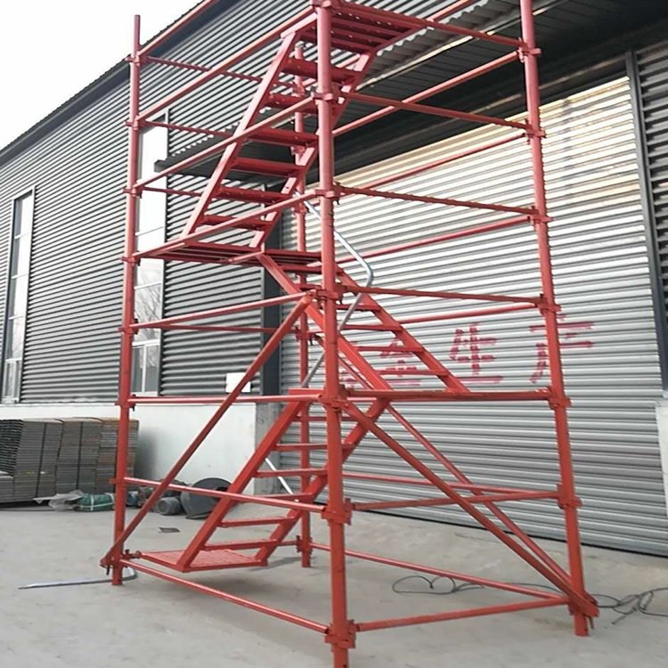 9.桥梁施工爬梯每隔1.5米安放一张带踏步Z字形楼梯,每隔4-5米需安置扣墙件,以大搭设高度为100米。桥梁施工爬梯脚手架主要构件为立杆、横杆和斜杆,立杆上每间隔50CM或者75CM或者100 CM设置有一排销库,销库由钢板冲压制成,通过夹具在钢管上,焊缝长度大,具有稳定性,横杆的两端分别设置有与销库相对应扣接并带有插片插头,横杆插头与立杆钢管接触的范围大,具有双向锁紧功能,每个销库节点可同时可装4 个横杆接头。销库节点结构合理,立杆轴向传力,使脚手架整体在三维空间结构强度高、整体稳定性好、并具有自锁功能,提高脚手架的整架稳定强度,并能更好的满足施工需要。建筑爬梯广泛应用于房建、桥梁、立交桥、涵洞、烟囱、水塔、大坝及大跨度棚架等多种工程施工中。 - 阜城县正祥建筑机械厂