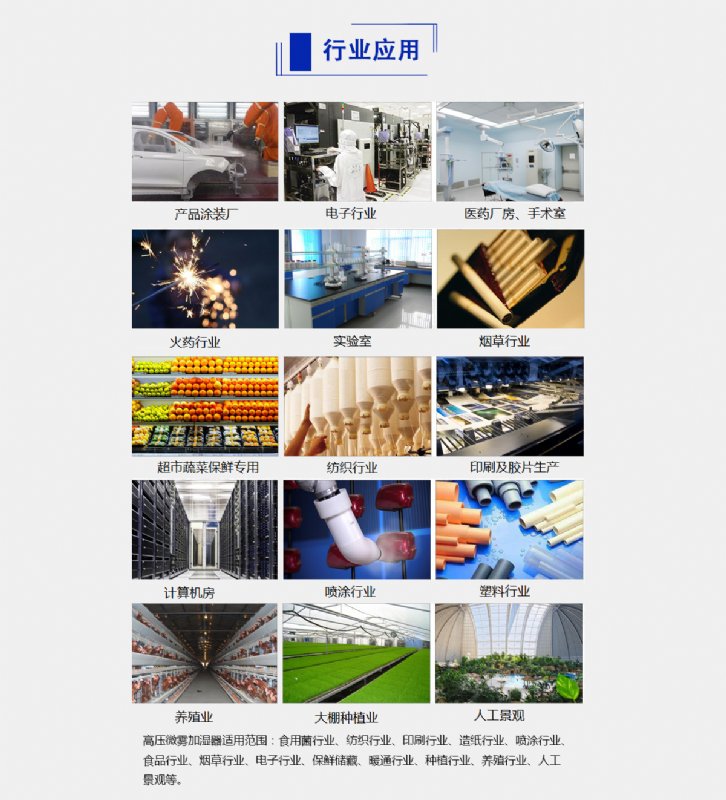 主营业务:超声波加湿器、高压微雾加湿系统、离心式加湿器、气水混合加湿器、湿膜式加湿器、除湿机、空气净化机