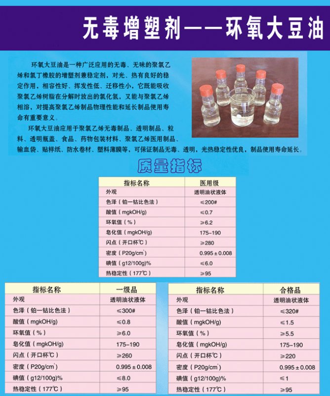 环氧大豆油是无苯的,具有*无味的特点。可用于保鲜代、保鲜膜、医疗器械、饮料瓶以及所有聚氯乙烯PVC产品。
