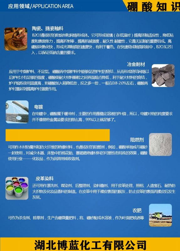 用 途:配制缓冲液。制备各种硼酸盐。蟑螂和地毯中黑色甲虫的杀虫剂。医药上用作止血药和防腐剂。